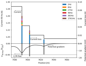 FIG. 11. The absolute current in the pipeline exemplary for the frequency of 90 Hz, and the current loss at each coating defect for all frequencies applied as block diagrams behind each other, resulting in a ground potential gradient along the section and derived IR-free potentials for each defect.