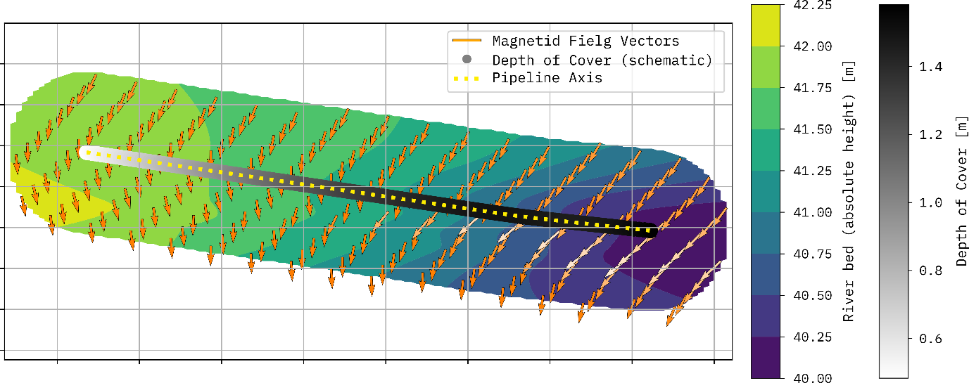 FIG. 5. An exemplary representation of the measured magnetic field vectors, resulting pipeline depth and ground level during an inspection of a river crossing.