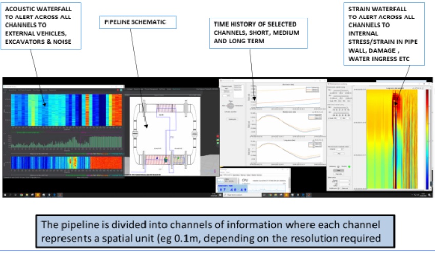 This approach is extremely sensitive to small stresses and strains in the wall of the pipe. A sensitivity of 2 microstrain has been measured during Stage 2 trials conducted during 2020. The resulting prototype dashboard is represented in Figure 6. One channel of information consists of about 1 m of fiber or 0.12 m of pipe length.