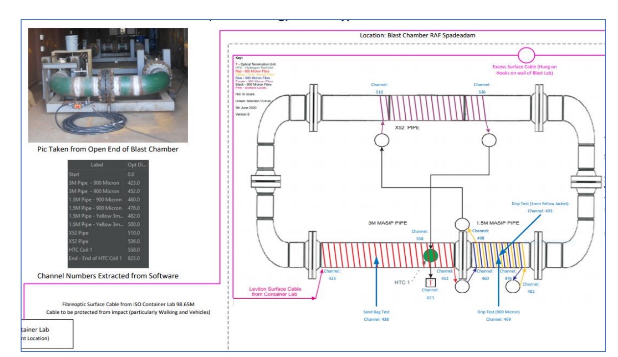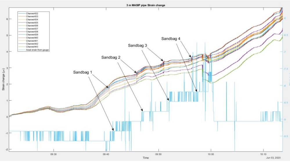 The pipe sections were also fitted with strain gauges and monitored with a parallel system so that the fiber-optic outputs could be monitored. All test witnessing was conducted remotely using a mix of video and data streaming tools that were available to the project engineers 24 hours a day for a month.