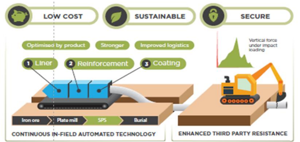 A key feature is that the high strength steel reinforcement can absorb more impact energy before puncture occurs. In addition , if puncture does occur, then there is no running crack as the crack energy is dissipated by the strip design whereas in conventional pipe the energy to drive a crack increases with crack length causing a running crack that can become a major hazard. This pipe structure provides the basis for mobile automated spiral intelligent pipe (MASiP) (Figure 2).