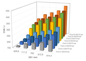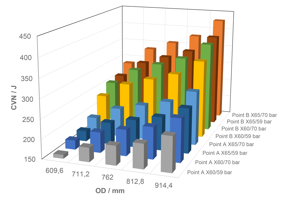 Optimizing the design in terms of minimizing the wall thickness (Point B in Figure 5) already leads to CVN minimum requirements much higher than 250 J and therefore with questionable quantitative significance already at the lowest considered pipe diameter of 24 inch.