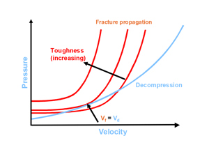 Figure 2 compares the decompression of the natural gas with the ductile fracture propagation velocity. If the crack propagates faster than the decompression, no fracture arrest occurs. In the case of faster decompression, the model predicts fracture arrest. The crack propagation velocity in turn depends on the resistance of the material to fracture propagation, which is described by the CVN impact strength.