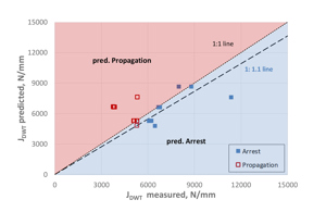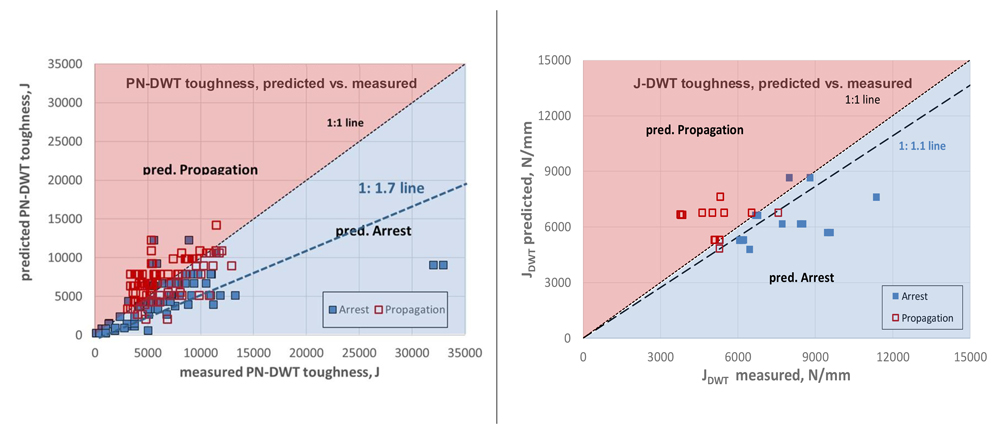 Figure 8 shows the predictions for arrest and running fracture based on the material toughness measured and evaluated by the modified BTC model. The prediction based on the J-DWT toughness measure is noticeably more accurate than based solely on the PN-DWT energy.