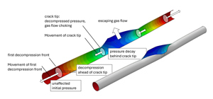 In a pipeline with a running fracture, two zones can be distinguished ahead of the crack tip in which the pressure regime of the medium is influenced in different ways (Figure 1). Starting from the crack tip, the first decompression front runs at acoustic velocity in the same direction than the propagating crack. Ahead of the decompression front the internal pressure remains unchanged at the initial pressure level (red color). Behind this front the internal pressure decreases up to the crack tip.