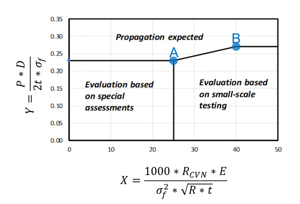 Fracture arrest is expected for X-values of 25 or greater if the associated Y-values are on or below the limiting curve. The assessment in this area is based on laboratory tests. Fracture arrest is also possible for X values of less than 25. However, there is no database from full-scale tests for this range. This is why a specific assessment is required including the option to perform full-scale tests.
