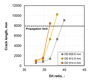 - propagation clearly exceeding the criterion of 8 m tolerable crack length. At D/t ratio 38.0, the pipes with OD 813 and 914 mm did not show arrest, while D/t ratios of 40 and above achieved propagation for all pipe OD considered in the parameter study.