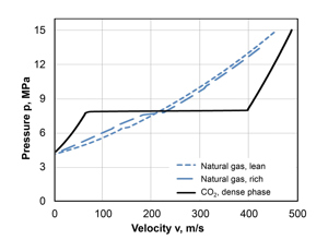 If the BTC model is also to be used for the prediction of fracture arrest for the transport of CO2 in the liquid or dense phase, it must be noted that CO2 decompression curves, due to the liquid-gas phase transition, show significant decompression retardation in comparison with natural gas, which are characterized by the formation of a plateau (Figure 3).