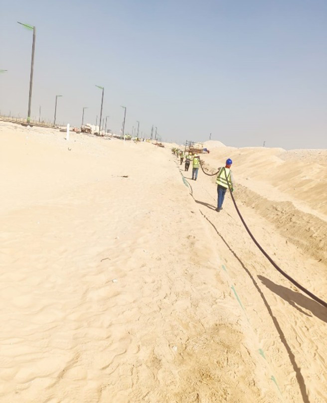This section outlines the proposed CP system by linear MMO anodes for new 8-in. and 6-in. underground header and branch underground piping’s network. The total length of the gas grid distribution piping network is 4,900 meters (m). The pipes will be protected by a permanent ICCP system for 25 yrs, according to CP specifications, by using new CP systems of 25V/15A rating. The MMO linear anodes consist of a long MMO/titanium (Ti) wire welded to multiple spots with copper cable packaged in fabric jacket and fulfilled with calcinated coke. The wire will be installed parallel to the pipelines in the same trenches by maintaining a minimum distance of 0.5 m–0.8 m (FIGS. 4 and 5).