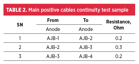 The CP system must be examined to confirm the proper installation of all components. It is crucial to verify the connections and continuity of the positive anode cables. Resistance measurement between various anode feeders and between different main positive cables is required to ensure electrical continuity. The resistance reading should be less than 1 ohm. Sample results of the continuity test are detailed in TABLES 1 and 2.