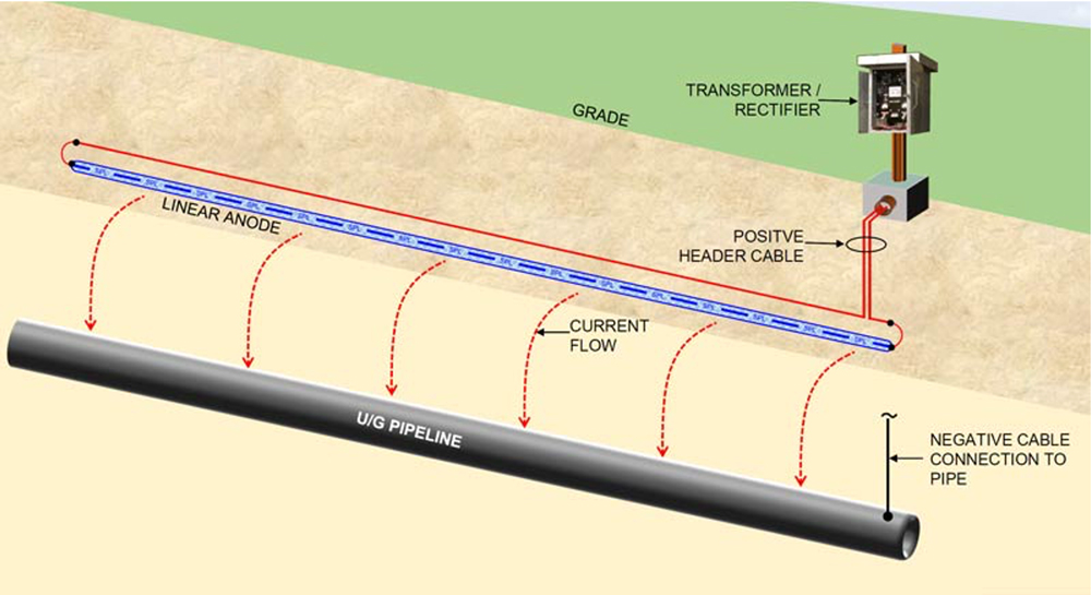 - The system eliminates stray current risks, close proximity to the piping being protected significantly limits current losses to other structures and virtually eliminates shielding and stray current concerns. This also significantly reduces the total current requirements for the system, reducing the rectifier requirements.