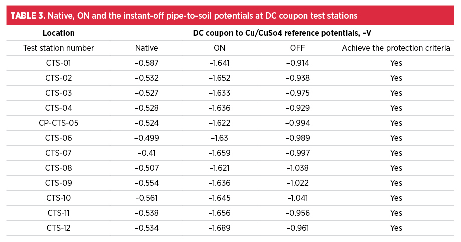 The CP commissioning activities were completed. During the commissioning, temporary sacrificial anodes were disconnected and the piping given 96 hrs to depolarize before the native potentials were measured. These lay in the range of –410 mV to –635 mV copper/copper sulfate (CSE) with an average of –550 mV. The permanent CP was commissioned and energized and the piping allowed to polarize for 48 hrs at 4.5 V/2.2 Amp setting. ON pipe to soil potentials were measured at all test stations and the instant-off pipe to soil potentials were then measured at DC coupon test stations. Both ON and instant-off potentials met the required CP criteria as specified in company specifications. The records of native, ON and the instant-off pipe to soil potentials are shown in TABLES 3 and 4.