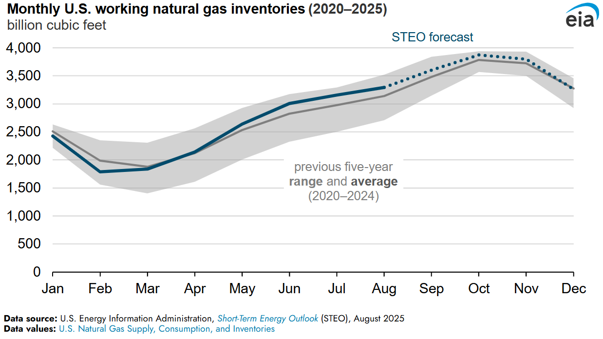 The EIA projects U.S. natural gas storage will reach 3,872 Bcf by the end of October, 2% above the five-year average. Strong early-season injections pushed inventories higher, though smaller weekly builds are expected as power demand and LNG exports rise.