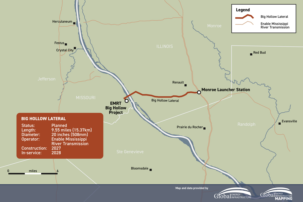 Energy Transfer’s Enable Mississippi River Transmission has proposed the Big Hollow Project, a 9.6-mile, 20-inch pipeline linking its Illinois system to Ameren’s planned Big Hollow Energy Center in Missouri.