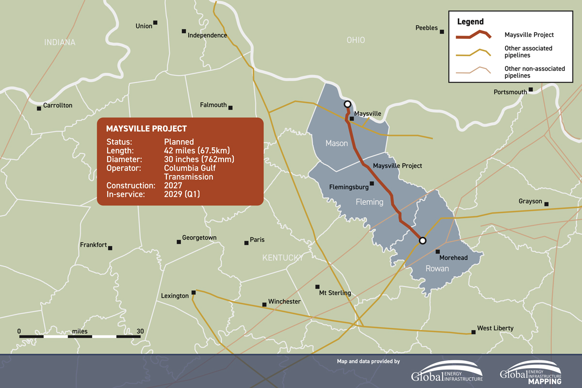 The Maysville Project is designed to provide 340,000 dekatherms per day of natural gas transportation capacity to serve the East Kentucky Power Cooperative’s Hugh L. Spurlock Power Station. The proposal includes construction of 42 miles of new 30-inch-diameter pipeline, a tie-in to the Columbia Gulf mainline, a new delivery meter station in Mason County, and three new mainline valves along the route.