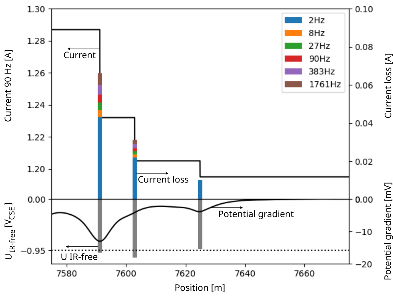 Situation. The surveyed pipeline partially traverses an airport perimeter and a nearby suburban neighborhood. FIG. 11 shows the current running in the pipeline at an exemplary frequency of 90 Hz as the black line. Additionally, the current loss is plotted at each defect as a colored bar stacked behind each other for the different frequencies applied. The resulting ground potential gradients (black line) and the calculated EIR-free (gray bars) are also displayed, indicating the relative size of the coating defect and the classification of defects according to the protection criteria of DIN EN ISO 15589-1 respectively. The black dotted line indicates an EIR-free of –0.95 V, with more negative values meeting the criteria for an effective CP protection.