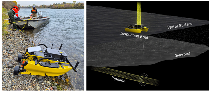 The magnetic field is detected and evaluated from several air-, land- and water-based inspection units, with up to 20,000 measurement points per second with up to 70 sensors (FIG. 3). The different units allow seamless over-the-line pipeline inspections independent of surface conditions. For example, at water crossings—where integrity surveys are critical—autonomous drones or inspection boats (FIG. 4) can be used. In the future, offshore pipelines in depths up to 3,000 meters (m) could be surveyed by intelligent underwater vehicles (ROVs).