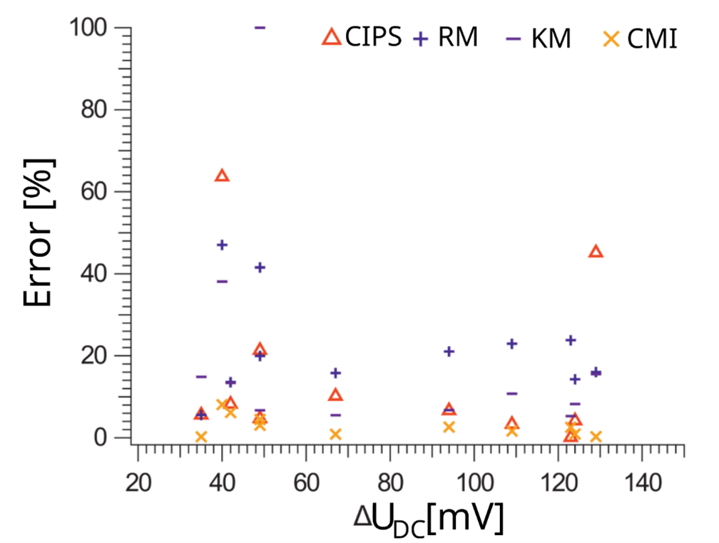 In addition to the localization of coating defects, the EIR-free was determined. According to German national standards body (DIN), European standard (EN) and International Organization for Standardization (ISO) 15589-1, the EIR-free is a sufficient parameter to confirm the effectiveness of a functioning CP system. FIG. 9 shows the error in the calculation of the EIR-free for various defect types and sizes across the different methods compared. The direct comparison shows that the CMI method allows a much more reliable determination of the EIR-free than the other compared methods [CIPS, reduction method (RM), correlation method (KM) and CMI], with an error consistently below 10%. Overall, CMI allows the calculation of the EIR-free with a higher sensitivity of at least a factor of five compared to the other methods.