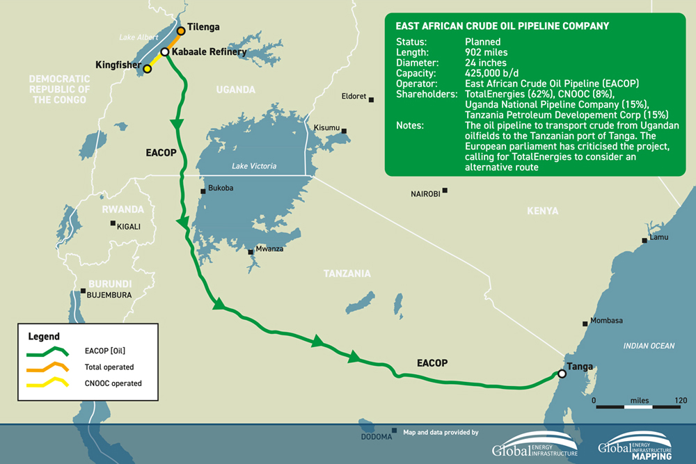 A 95-km Tilenga feeder pipeline will be constructed to a delivery point at Kabaale (the location of the new refinery), from where the crude will be distributed either to the proposed crude processing facility or to the 898-mile (1,445-km), 24-inch East Africa Crude Oil Export Pipeline (EACOP), which will convey the crude oil from Kabaale to an export terminal in the coastal city of Tanga, Tanzania for further shipment to international markets, according to the Petroleum Authority of Uganda (PAU).