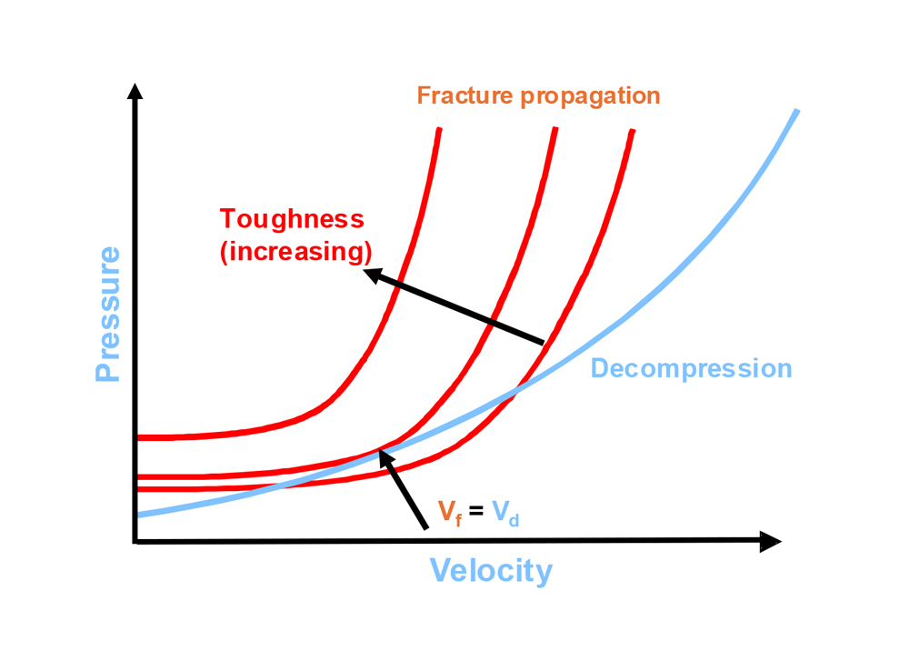 Figure 2 compares the decompression of the natural gas with the ductile fracture propagation velocity. If the crack propagates faster than the decompression, no fracture arrest occurs. In the case of faster decompression, the model predicts fracture arrest. The crack propagation velocity in turn depends on the resistance of the material to fracture propagation, which is described by the CVN impact strength.