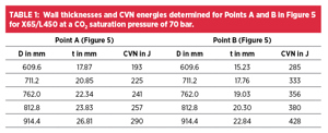 The wall thicknesses and CVN energies determined for Points A and B are exemplified in Table 1 for X65/L450 grade line pipe with diameters ranging from 609.6 to 914.4 mm (24 to 36 inches). A CO2 saturation pressure of 70 bar was assumed. This value is achieved, for example, at a content of 6.0 % N2 in the CO2 and a temperature of 17°C [9]. The effect of variation of the grade and the CO2 saturation pressure is shown in Figure 6, considering X60 and X65, in line with DNV-RP-F104, and CO2 saturation pressures of 59 and 70 bar.