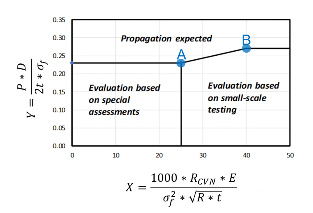 Fracture arrest is expected for X-values of 25 or greater if the associated Y-values are on or below the limiting curve. The assessment in this area is based on laboratory tests. Fracture arrest is also possible for X values of less than 25. However, there is no database from full-scale tests for this range. This is why a specific assessment is required including the option to perform full-scale tests.