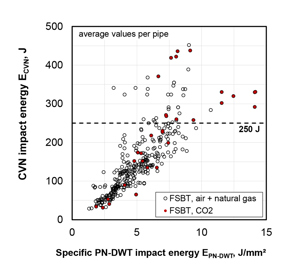The adaptation is necessary to account for the characteristic delayed CO2 decompression behaviour with a pronounced saturation plateau [4]. The derivations have proven to be conservative, latest by Cosham et al. in [5]. Apart from the need for more test results, discussions arise whether high toughness requirements in terms of Charpy V-notch (CVN) impact energy (ECVN) exceeding 250 J are justified due to the limited significance of the test for high-toughness line pipe steels.