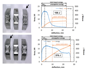 Figure 4b is typical of a high level of impact energy of 350 J and above. From the energy curve it is no longer possible to distinguish between energy required for fracture propagation or for bending. In this case, the high CVN impact energy no longer quantitatively describes the resistance of the material to fracture.