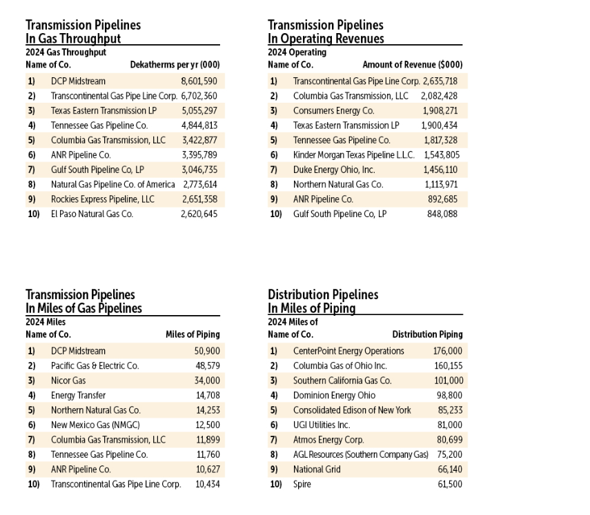 Each year, P&GJ’s 500 Report provides the industry’s most comprehensive listing of U.S. energy pipeline systems, ranking gas distribution, gas transmission and liquids pipeline companies. Gas distribution companies are ranked by number of customers. Gas transmission companies are ranked by miles of pipe operated, while liquids pipeline companies are listed by total crude oil and products delivered.