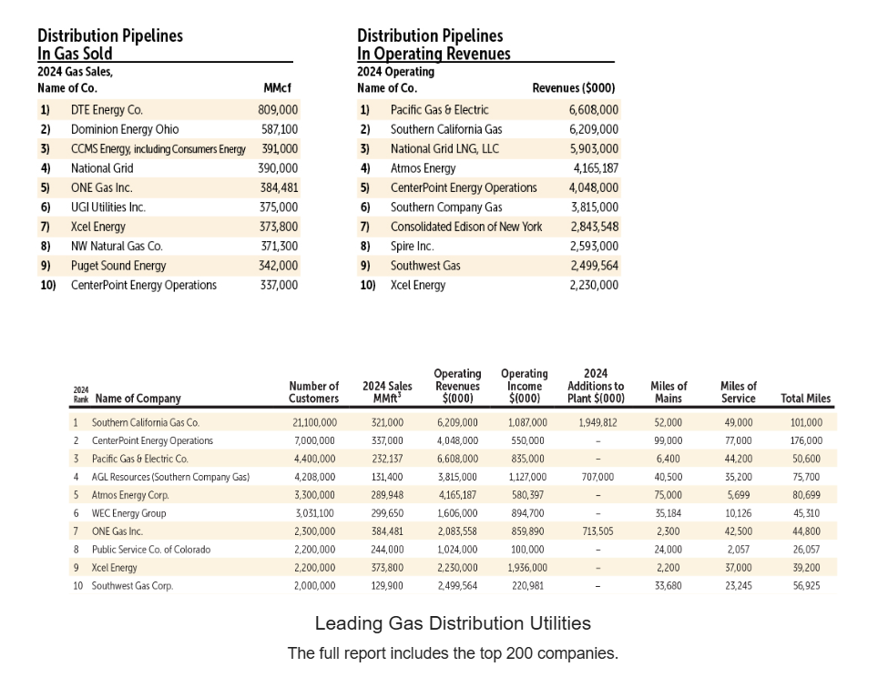 (P&GJ) — The companies leading Pipeline & Gas Journal’s (P&GJ’s) latest 500 Report will look familiar, though the newest rankings reveal notable reshuffling across several key metrics as operators continue to adjust to evolving market conditions. Among U.S. gas distribution utilities, rankings vary depending on the measure examined, highlighting differences in system scale, sales volumes and financial performance.